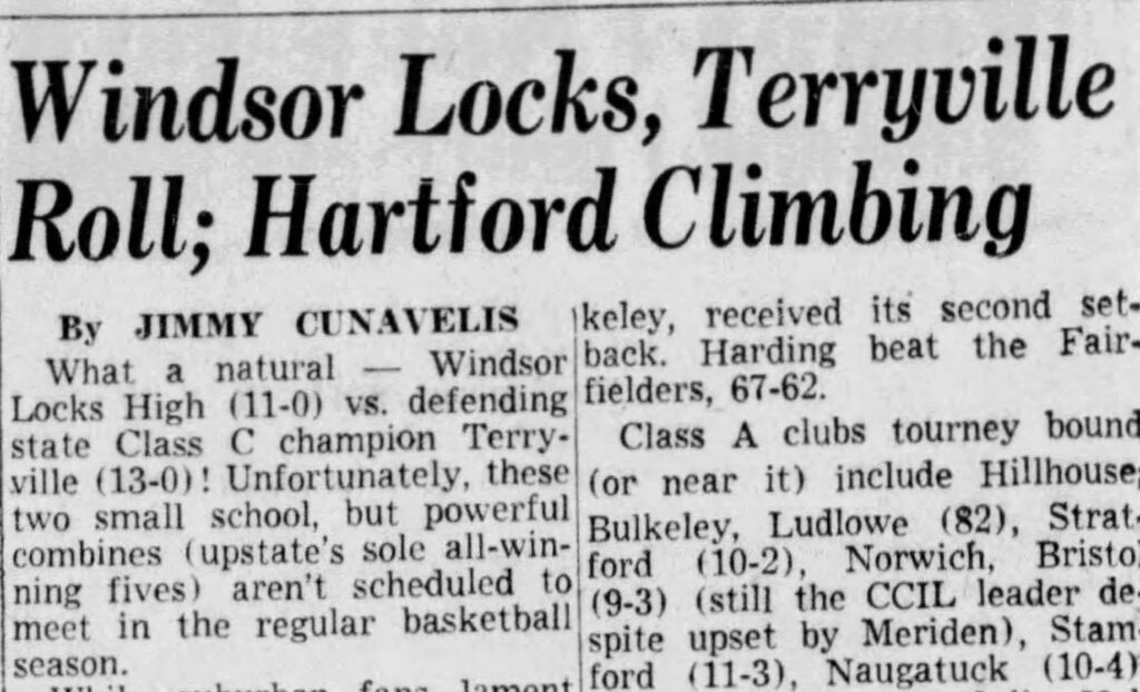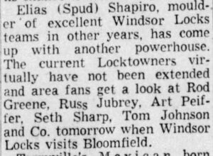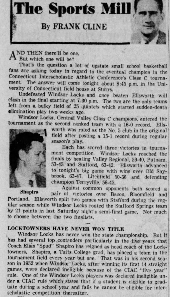 Spud coached the 1955 Windsor Locks High School basketball team to a 19-1 record. They lost the state “C” division championship game held at the University of Connecticut to South Windsor High School.