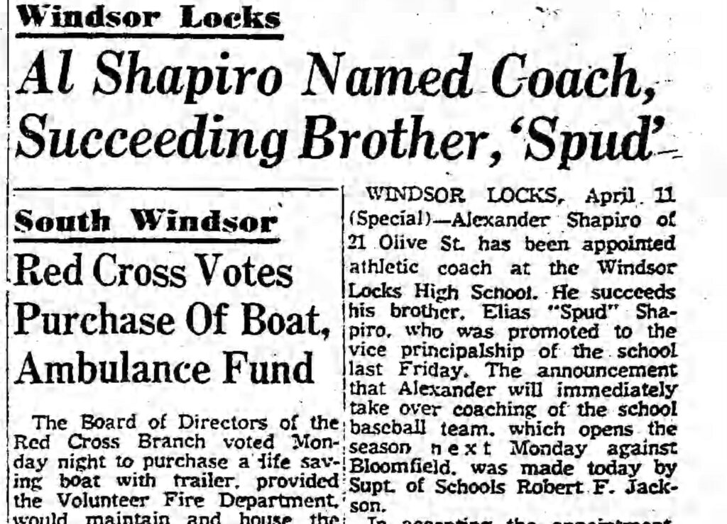 He also coached the Windsor Locks High School baseball team to a 22-13 record over five years, earning his best record in 1954 with 6 wins and 2 losses.