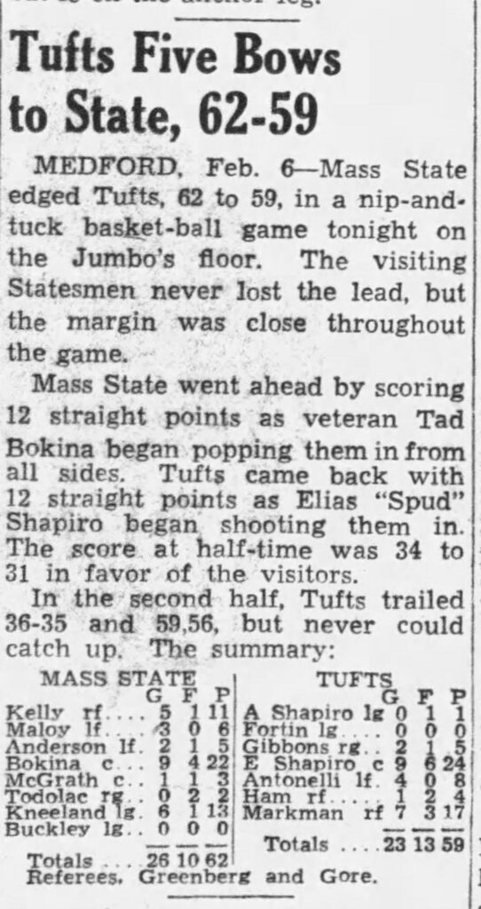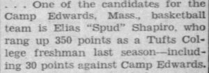As a freshman at Tufts University in 1943, Spud continued setting scoring records in basketball. His 350 points were more than any other freshman player in the country, earning him Honorable Mention All-American honors.