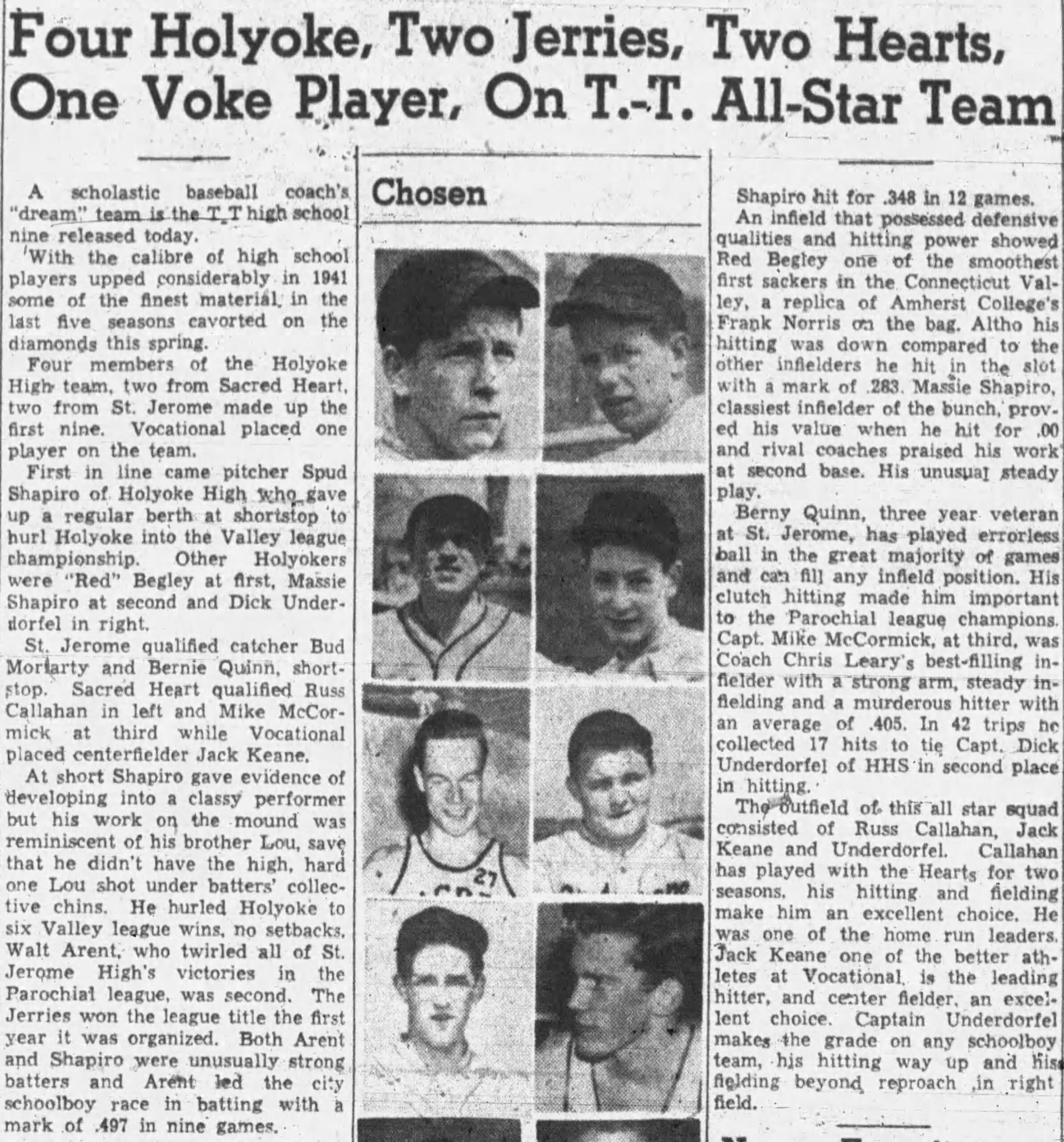 Spud also excelled on the baseball field, being twice selected to the annual Transcript-Telegram All-Star school boy baseball team for pitching in his junior year and for fielding in his senior year.